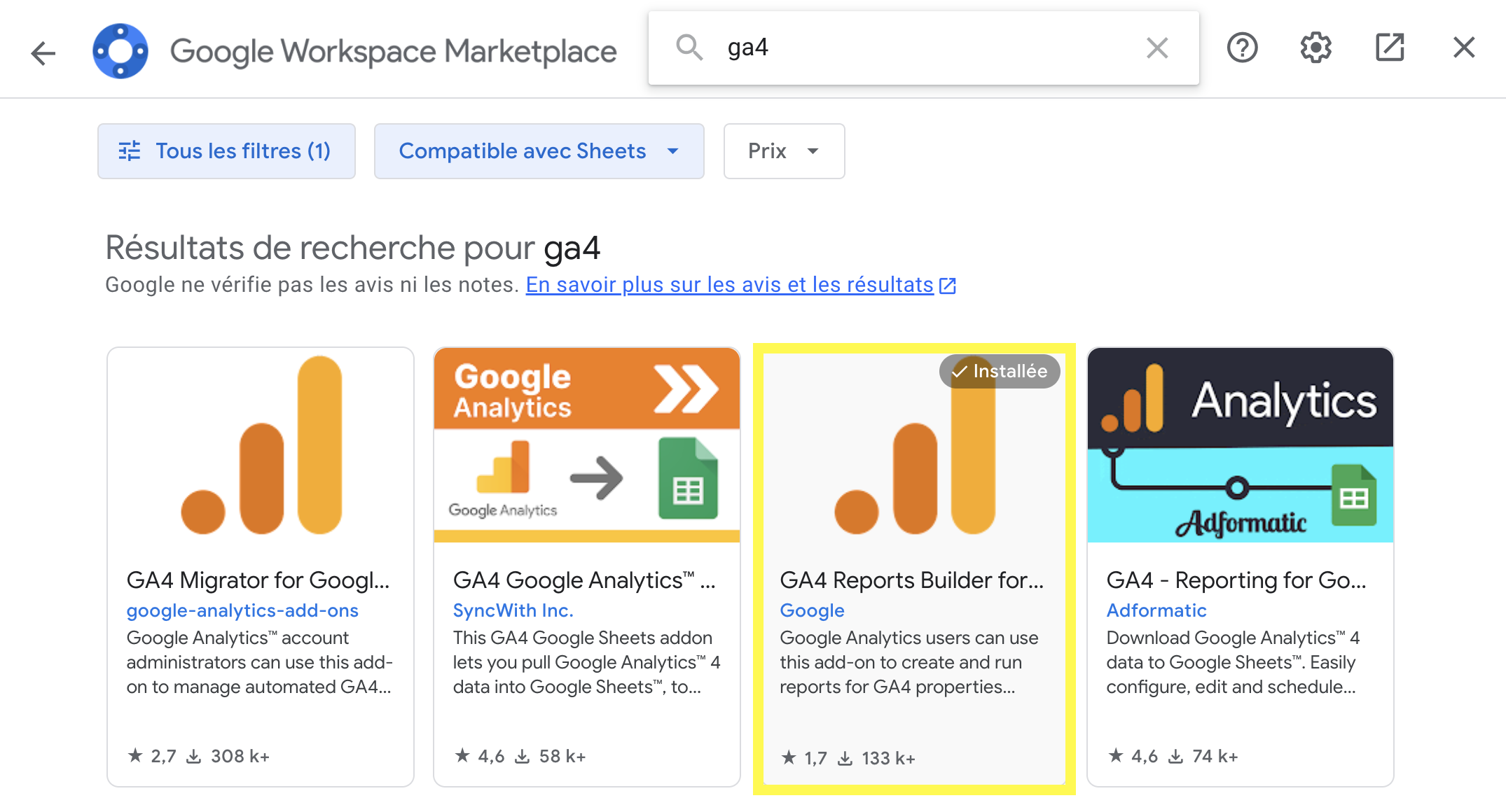 3. Type ga4 in the search bar and install “GA4 Reports Builder for Google Analytics”.
